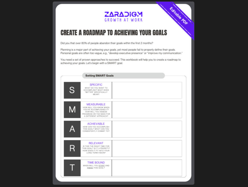 ❷ A Progress MeasureThe success measure defines how we determine achievement or how we will know that we have reached your goal.The progress measure defines how you'll track progress. How will you be able to detect if you're moving the needle in the right direction? What signs or markers are you observing? How frequently should you "take a probe" to see what's working?You can use this PDF to develop realistic goals you will more likely achieve - based on science and empirical evidence from hundreds of leaders like you.